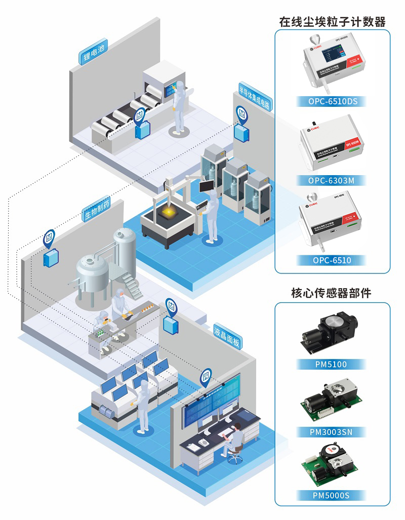 四方光電基于12年光散射技術(shù)的研究與創(chuàng)新,推出了在線塵埃粒子計(jì)數(shù)器OPC-6500F、OPC-6303M和OPC-6510,以及核心零部件激光塵埃粒子計(jì)數(shù)傳感器PM5000S、PM3003NS和PM5100,可廣泛應(yīng)用于百級(jí)、千級(jí)、萬級(jí)、十萬級(jí)等潔凈室環(huán)境。