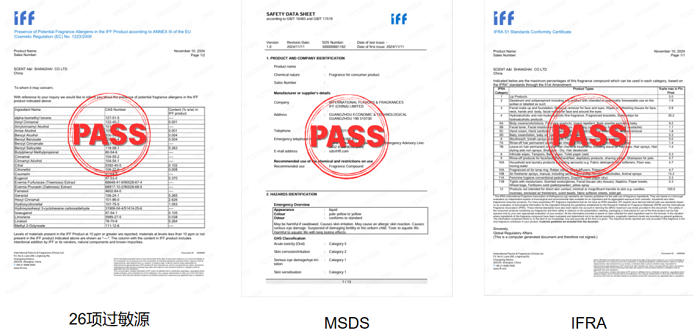 與傳統(tǒng)香氛不同,車規(guī)級香氛發(fā)生器要求從香精原料到香氛,最后到成品香氛棒都必須經(jīng)過多項安全試驗驗證測試。香精原料必須獲得IFRA(國際日用香料香精協(xié)會安全證書)、MSDS(學品安全技術說明書)和Allergens(過敏原檢測合格)三項權威安全認證證書,并且要提供不含甲醛的聲明,確保原材料的安全健康。四方光電依據(jù)主機廠標準,精選合作香精公司的優(yōu)質(zhì)原料,均滿足IFRA、MSDS、Allergens三項權威認證,確保香精安全健康。