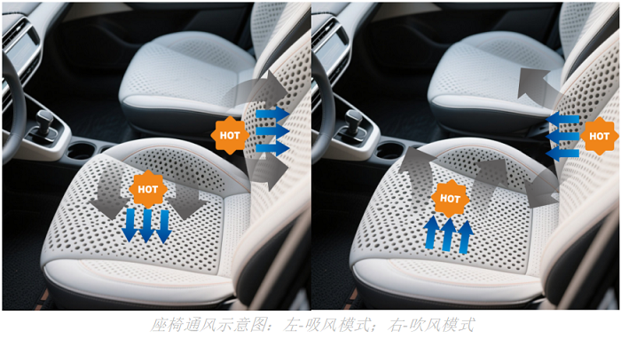 座椅通風(fēng)系統(tǒng)直接從根源驅(qū)散熱量,快速降低座椅溫度。其內(nèi)置的座椅風(fēng)扇運(yùn)轉(zhuǎn)產(chǎn)生氣流,透過(guò)導(dǎo)風(fēng)層均勻從打孔皮面排出(吹風(fēng)式)或?qū)⑷梭w背部的濕熱空氣抽走(吸風(fēng)式),加速人體與座椅接觸面間的熱量交換和汗液蒸發(fā),達(dá)到持續(xù)降溫的目的。